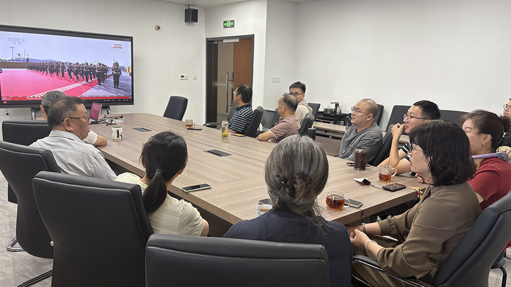 当屏幕里受阅方队迈着铿锵步伐依次驶过天安门广场时,雄壮的军乐响彻云霄,先进的受阅武器装备与空中梯队轮番亮相,在场每一位员工都全神贯注地紧盯屏幕。心中的自豪感与使命感如浪潮般激荡——是对革命先烈的深切缅怀,是对祖国今日强盛的由衷赞叹,更是对当下和平幸福生活的无比珍惜。