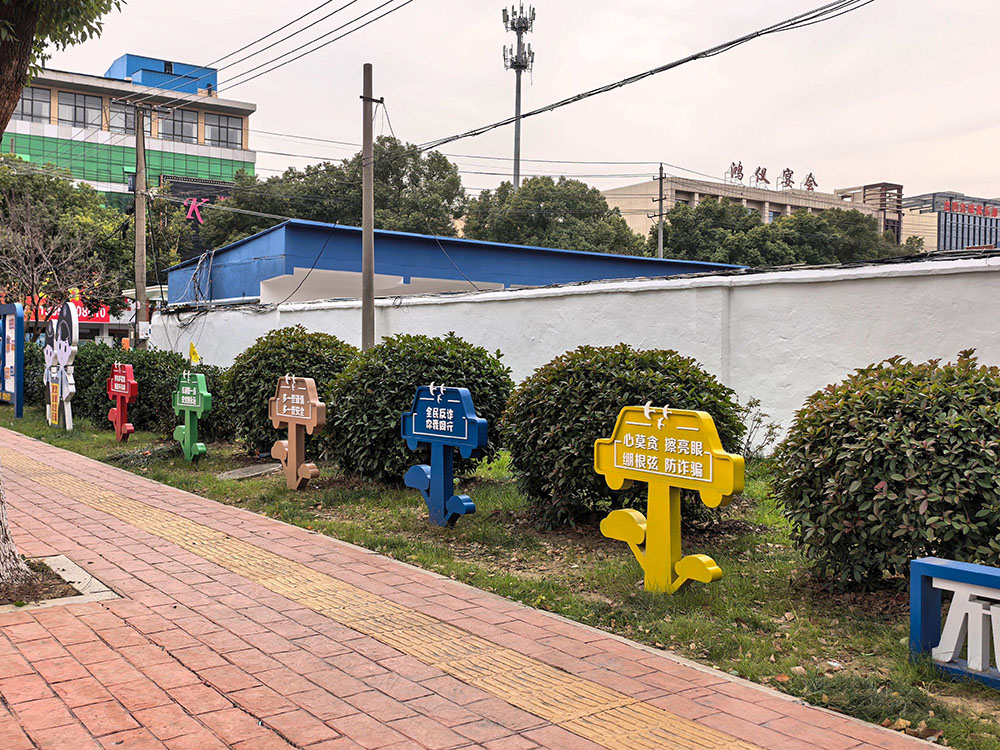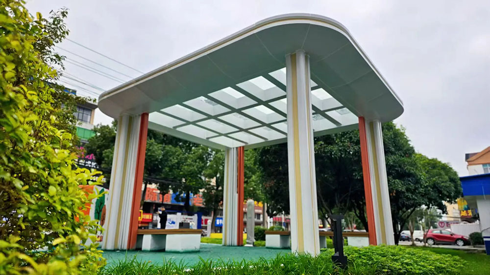 “景德客厅”的设计突破单一休闲功能局限,构建起“休憩+科普”的复合功能体系。依托毗邻交警中队的区位优势,项目专门设置交通安全宣传栏,打造兼具科普教育与文化展示功能的专属区域,系统传递城市管理规范、垃圾分类知识等内容,推动宣传模式从“被动接收”向“主动认知”转变。同时,聚焦基础休闲需求,规划建设休憩亭、便民座椅等设施,为周边居民及户外劳动者提供舒适便捷的休憩空间,成功实现“休憩有阵地、知识有传递”的双重价值目标。
