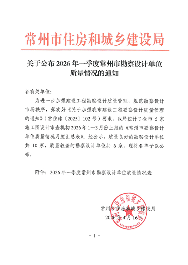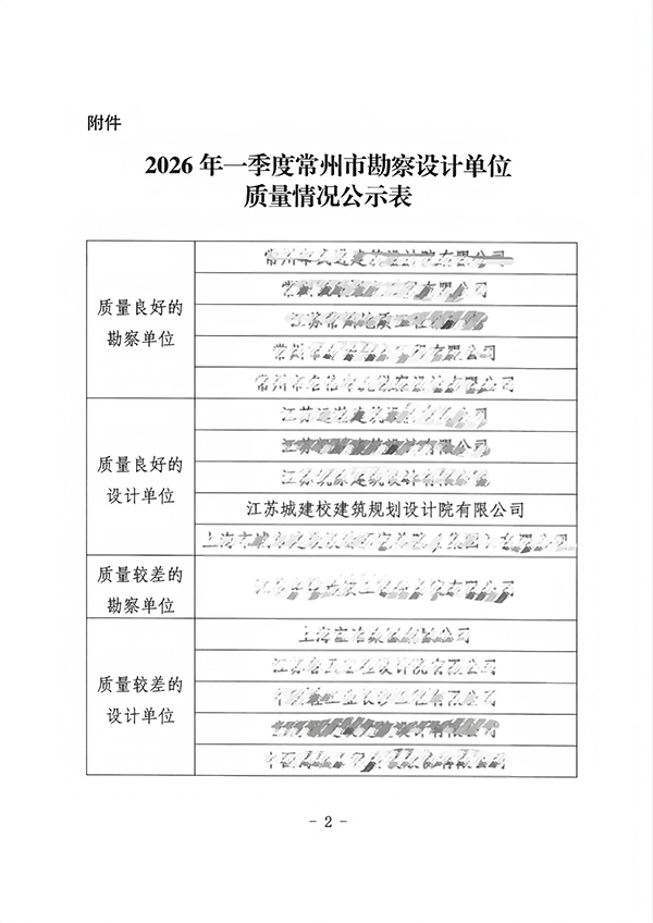 继2025年第四季度获得常州市住房和城乡建设局“质量良好的设计单位”称号之后,今年一季度我院再次荣获此项荣誉,充分彰显了上级行业主管部门对我院在建设工程勘察设计质量管理领域持续努力与卓越表现的高度认可。