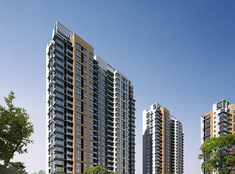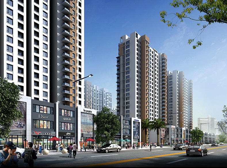 小区整体建筑风格采用现代主义风格,与周边已有环境相协调呼应,大气的落地玻璃窗、精美的出挑线条,明快的立面色彩,无不反映出小区欣欣向荣、生机勃勃的一面;沿街布置的3层商铺,不仅满足了小区内居民自身的日常购物需求,同时也服务着周边其他小区的居民,为当地居民带来更多的购物便利。小区内设6米环通车道,提倡人车分流系统,融入交往和景观标志的功能,设置完整的绿化步行道贯穿于小区内部,增加小区空间的趣味性。