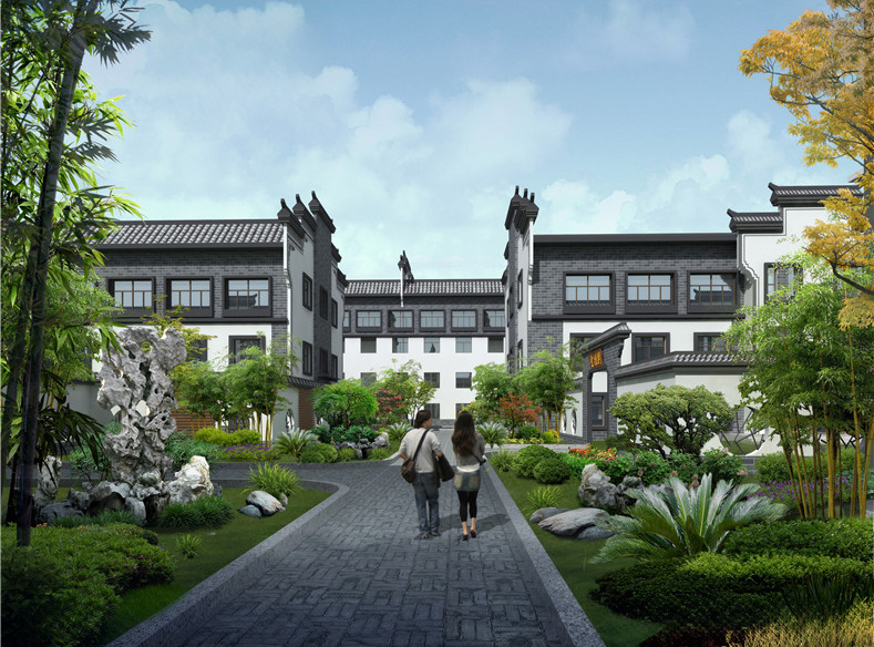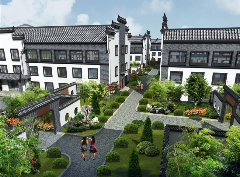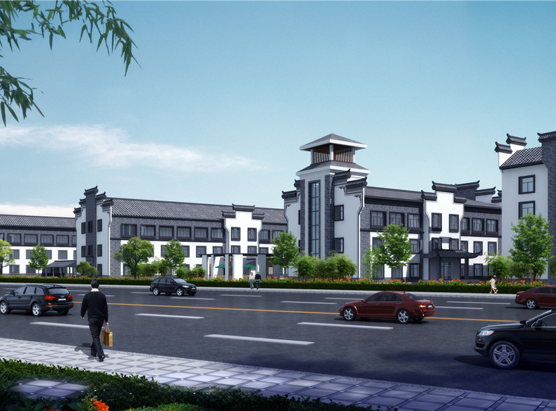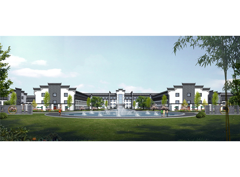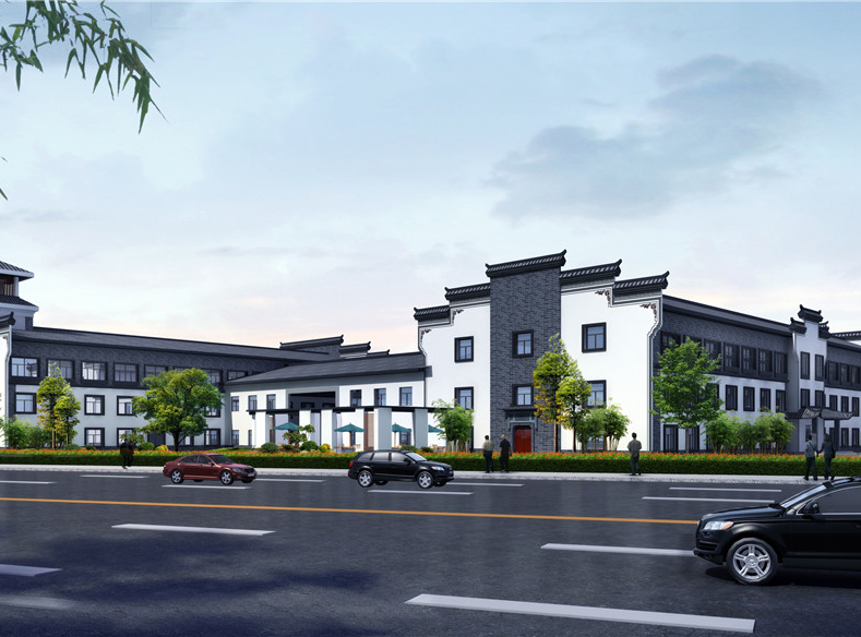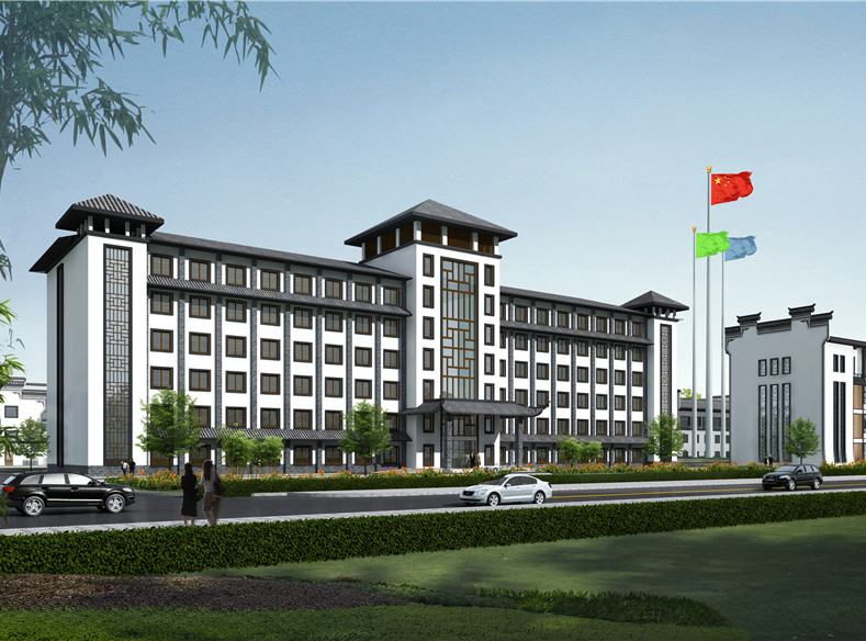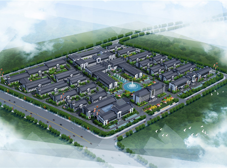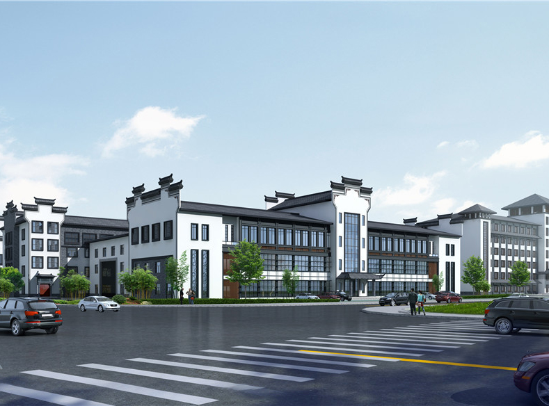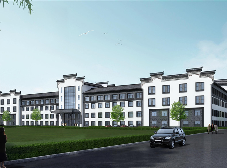 本项目地块内建筑四周均为环形消防车道,景观中轴线依次设有充满现代感的办公大楼、微波粼粼的景观水池及大气恢弘的金儒园车间。建筑立面采用徽派风格,高大的马头墙及青灰色砼筒瓦,与蓝灰色、乳白色外墙涂料使得建筑立面更加生动。研发楼、办公楼、宿舍楼位于地块南面,沿街城市面丰富且充满现代感,且有充足的日照;车间部分位于地块中部及北部,与南侧生活办公区形成明显的功能分区,互不干扰,却又彼此联系便捷。