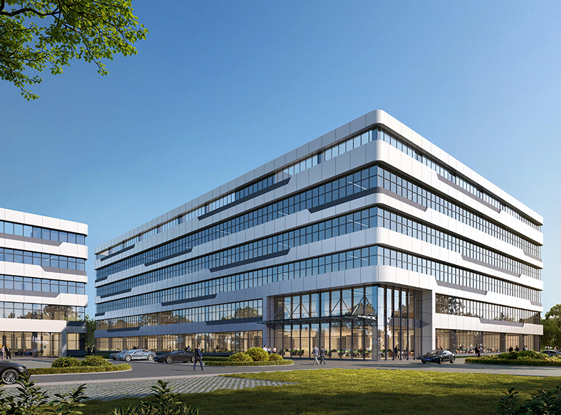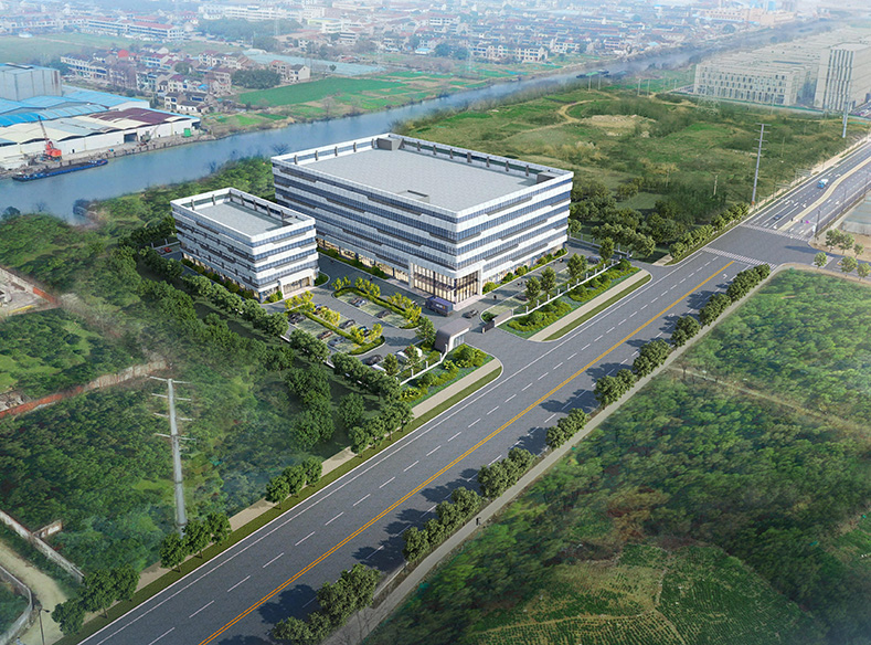 本项目为新能源测试电子类企业,是钟楼区引进的常州市重大项目之一;建筑外观结合企业特色采用线路板、流水形元素,突出建筑的科技感与辨识度。厂区入口与沿市政道路处设景观广场结合停车,车间位于地块北侧,南侧设综合楼,使生产区与配套区有机分隔;消防道路沿车间环通。车间为5层,局部地下一层设消防泵房与消防水池,1~4层为普通电子加工车间,5层为净化车间,屋顶设生产设备区。综合楼为4层,属于生产配套用房,其中一层为员工餐厅,二层为活动中心,三、四层为办公。
