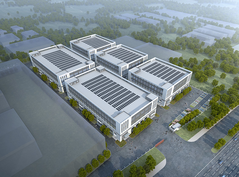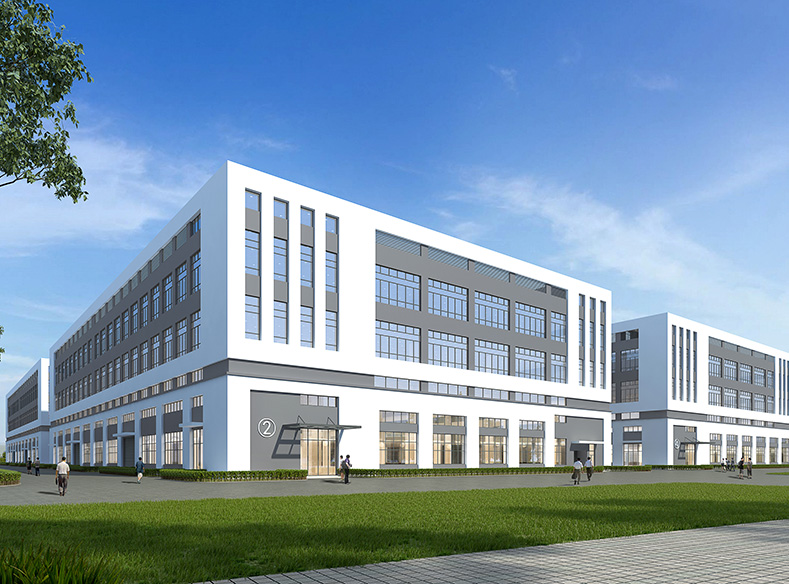 为体现建筑的现代化工业气息,采用现代设计风格。考虑整体效果的同时考虑经济性及生产功能的实用性,整体为规整的矩形体型。通过窗户的尺度控制与墙面形成虚实变化,采用工业化的配色,深灰色搭配白色真石漆,用现代化的气息体现企业蓬勃向上勇于开拓的精神。整个厂区每栋建筑四周均配有绿化,在满足生产同时,尽可能为广大员工提供工作之余放松身心的条件,创造人性化的工作环境。